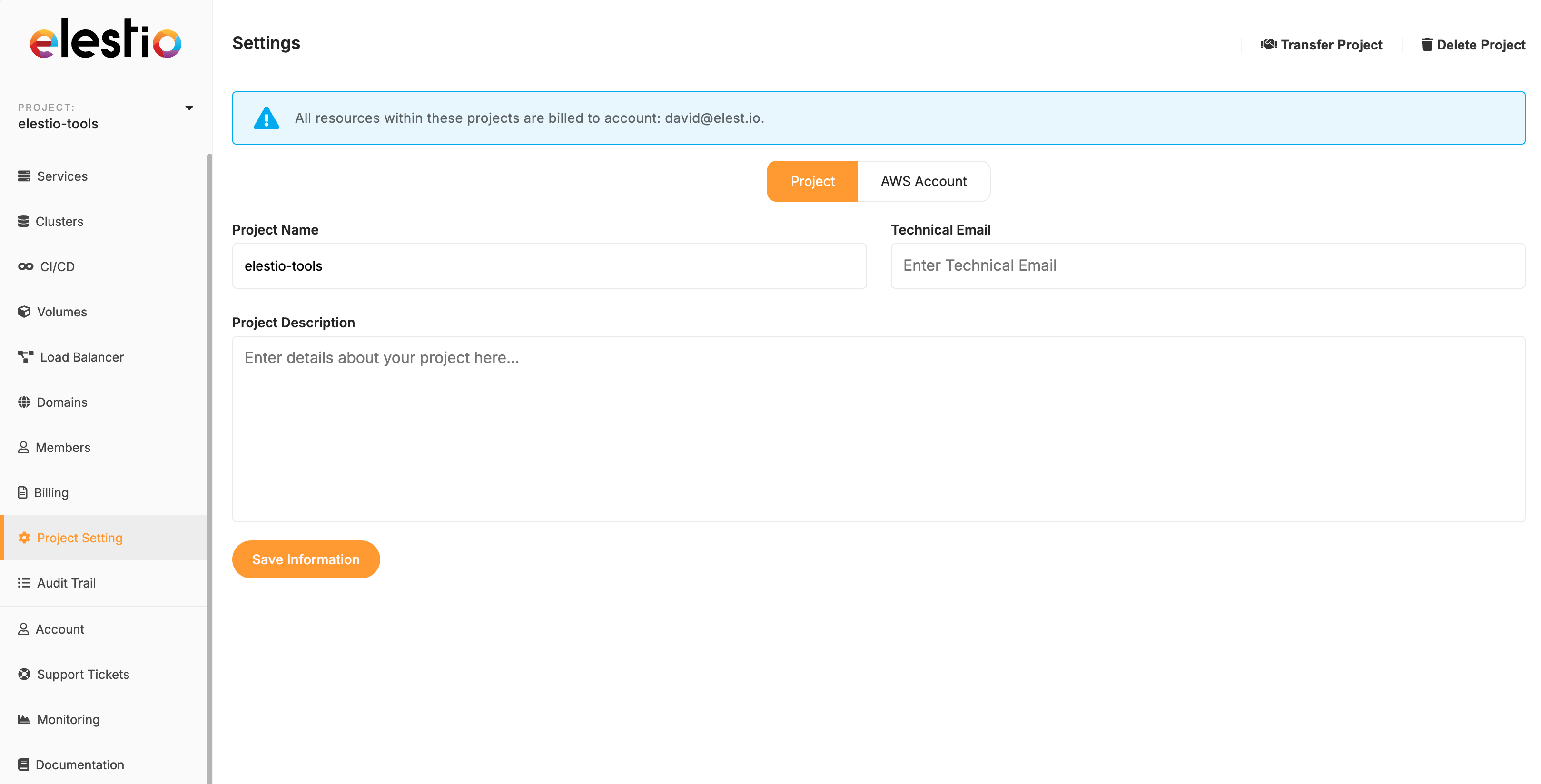 Log in to your Elestio account and select the project you want to transfer. Click on the Project Settings tab.