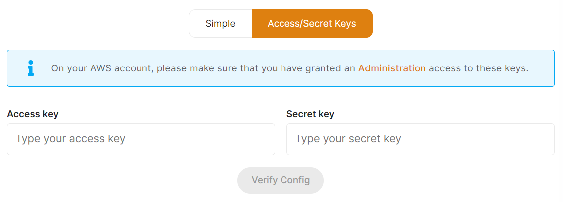Now Configure your AWS Account with Elestio. We offer two types of connections: simple and access/secret keys.