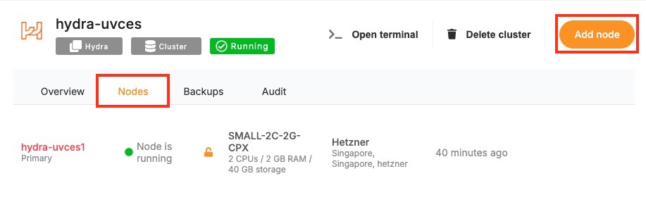 To begin, log in to the Elestio dashboard and navigate to the Clusters section from the sidebar. Select the cluster you want to scale. Once inside the cluster view, switch to the Nodes tab. This section provides an overview of all current nodes along with their health status and real-time resource usage.