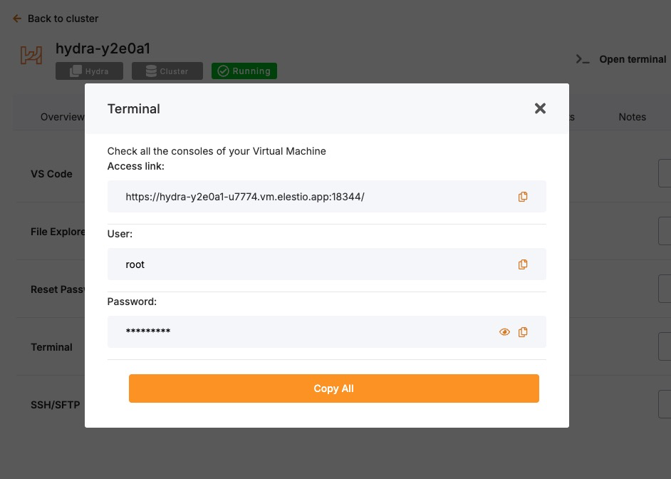 Head over to your deployed Hydra service dashboard and head over to Tools > Terminal. Use the credentials provided there to log in to your terminal.