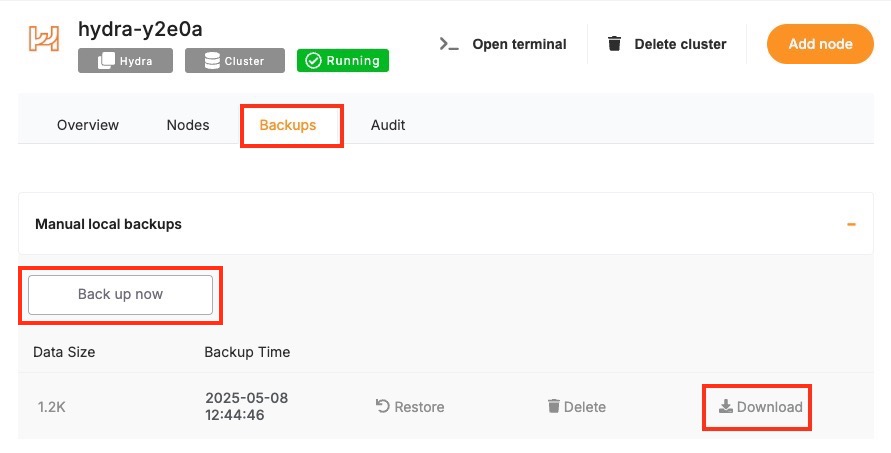 Hydra/PostgreSQL provides a set of command-line tools that are useful when you want to create backups from your terminal. These include pg_dump exporting the database, psql for basic connectivity and queries, and pg_restore restoring backups. This approach is useful when you need to store backups locally or use them with custom automation workflows. The CLI method gives you full control over the backup format and destination.