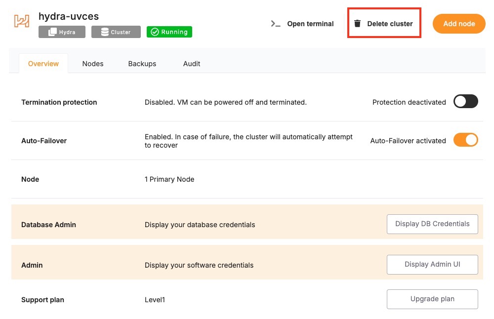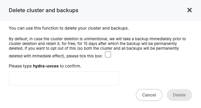 Deleting a cluster is a final step often performed when decommissioning an environment. This could include shutting down a test setup, replacing infrastructure during migration, or retiring an unused production instance. In some cases, users also delete and recreate clusters as part of major version upgrades or architectural changes. It is essential to confirm that all data and services tied to the cluster are no longer required or have been backed up or migrated before proceeding. Since cluster deletion is irreversible, any services, volumes, and backups associated with the cluster will be permanently removed.