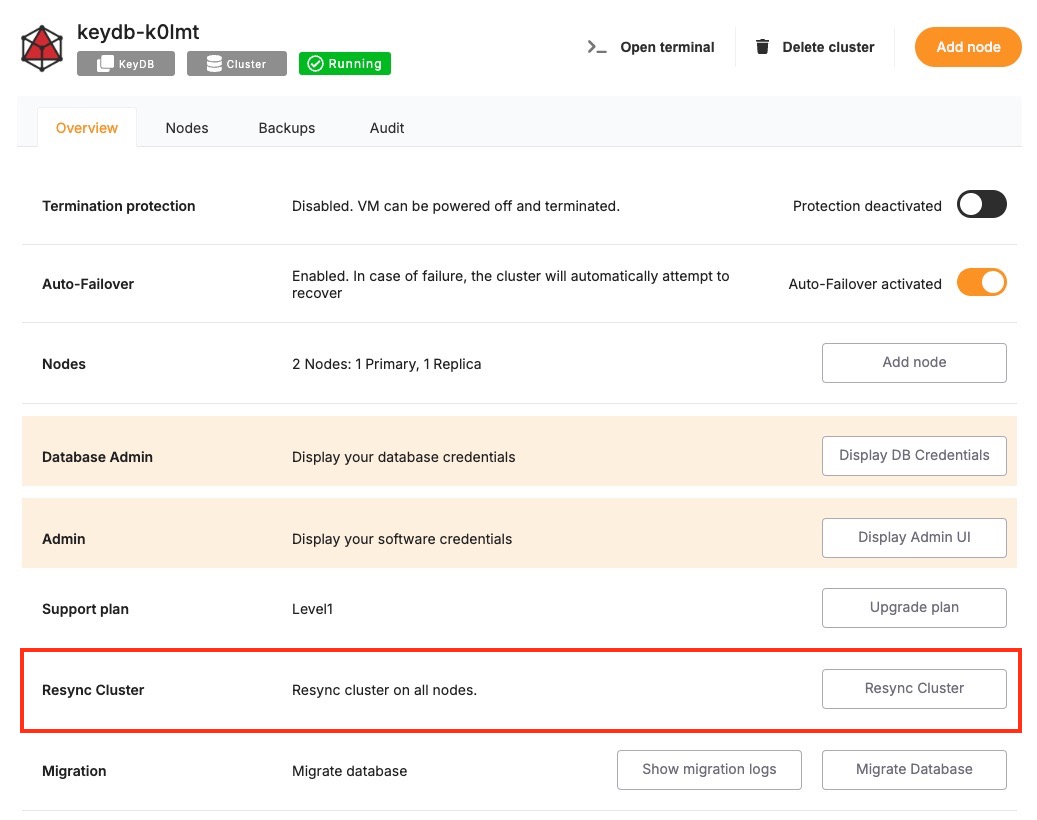 - This action is best used when you’re confident that the primary node is healthy, current, and stable. Avoid initiating a resync if the primary has recently experienced errors or data issues. Additionally, consider performing this operation during a low-traffic period, as synchronization may temporarily impact performance depending on the data volume.