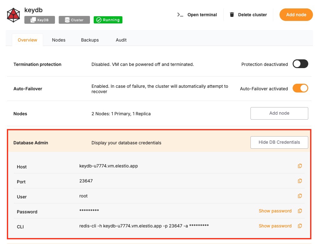 These values can usually be found in the Elestio service overview details as shown in the image below, make sure to take a copy of these details and add it to the code moving ahead.