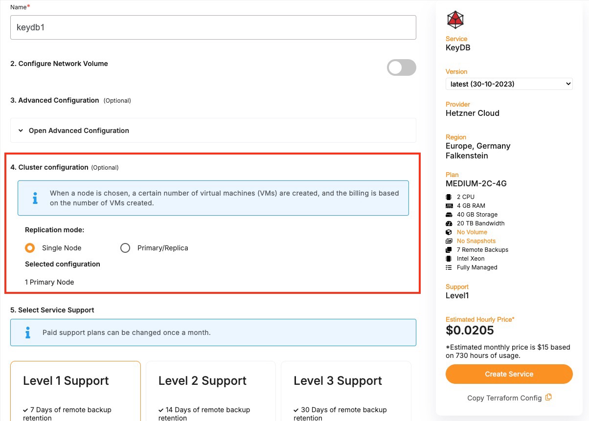 If you’re setting up a high-availability cluster, the dashboard also allows you to configure cluster-related details under Cluster configuration, where you get to select things like replication modes, number of replicas, etc. After you’ve configured the cluster, review the summary to ensure all settings are correct. Click the Create Cluster button to begin provisioning.