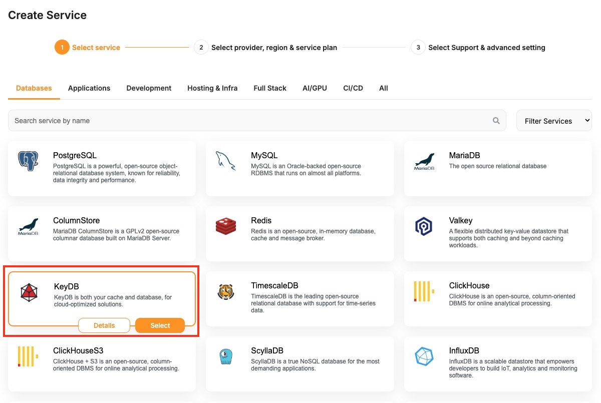 Now, select the database service of your choice that you need to create in a cluster environment. Click on Select button as you choose one.