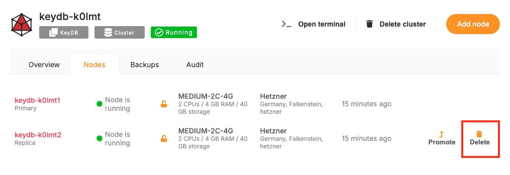 Before removing a node in Elestio, it’s important to review the services and workloads currently running on that node. Since Elestio does not automatically redistribute or migrate workloads during node removal, you should ensure that critical services are either no longer in use or can be manually rescheduled to other nodes in the cluster. This is particularly important in multi-node environments running stateful applications, databases, or services with specific affinity rules.
