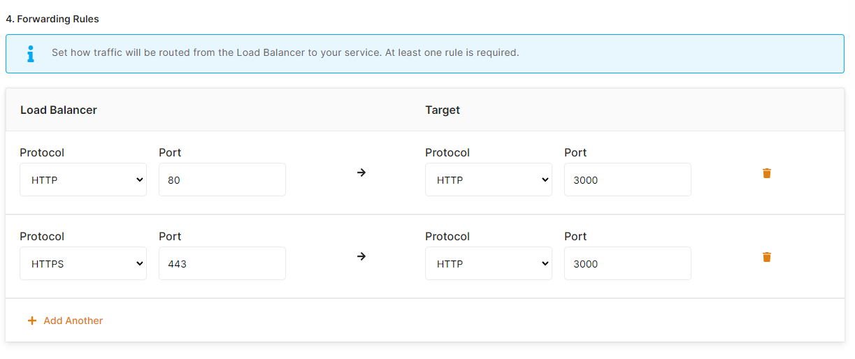 Next, configure your forwarding rules from the load balancer to the targets. All incoming traffic will be sent to targets based on the rules defined below, the load balancer will use the "least connections" algorithm to decide where to send the traffic and taking account of target health.
