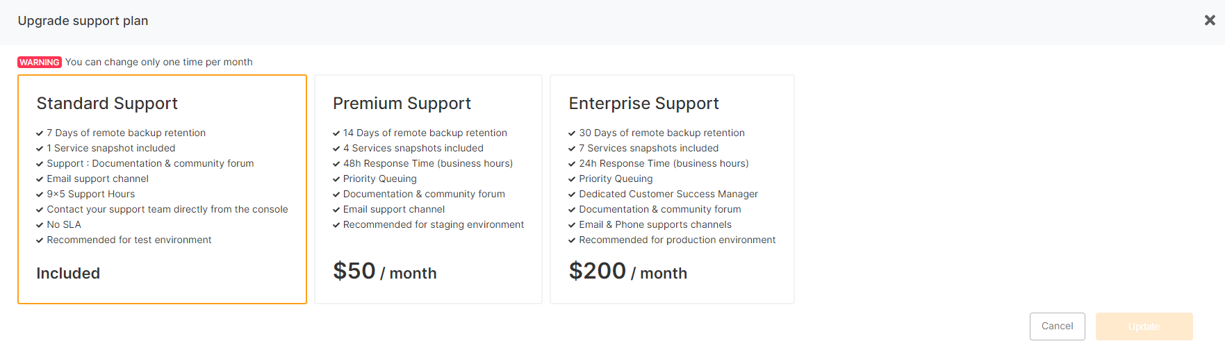 While it's possible to change support plans, it's important to note this is only possible once every 30 days.